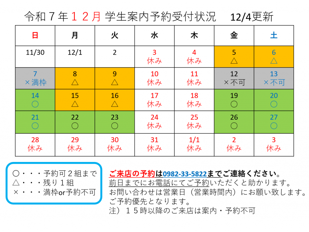 メールではなく前日(営業時間内)までに0982-33-5822まで直接ご連絡いただくと助かります。