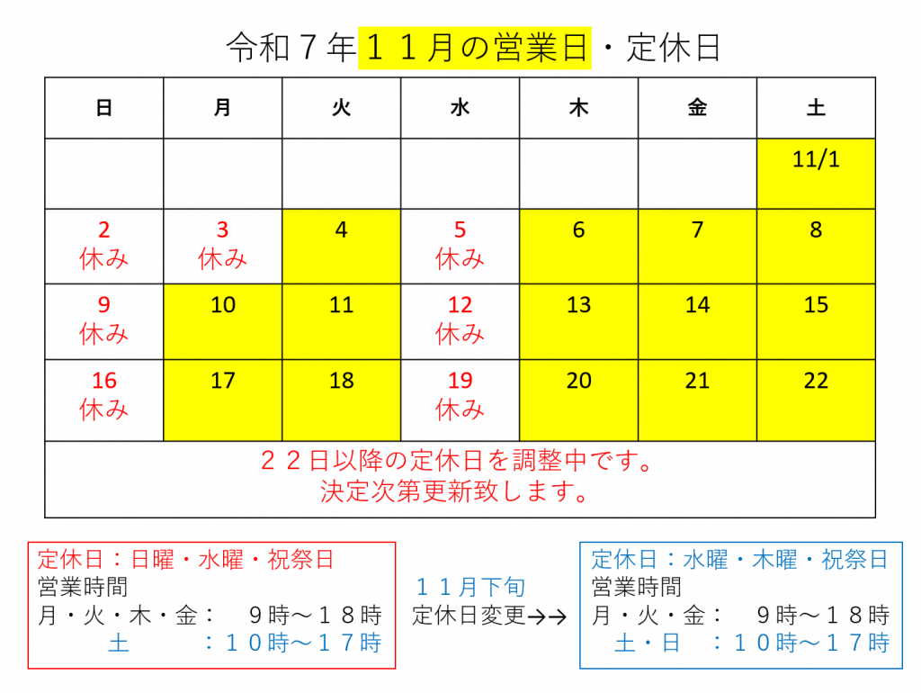 11月下旬より定休日が毎週水曜日、木曜日、祝祭日となります。現在調整中です。